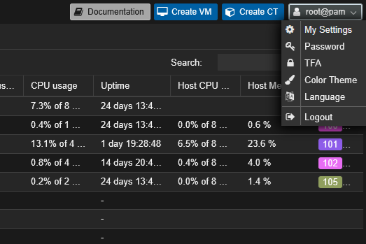 1. 우측 상단에 root@pam 부분을 누릅니다.